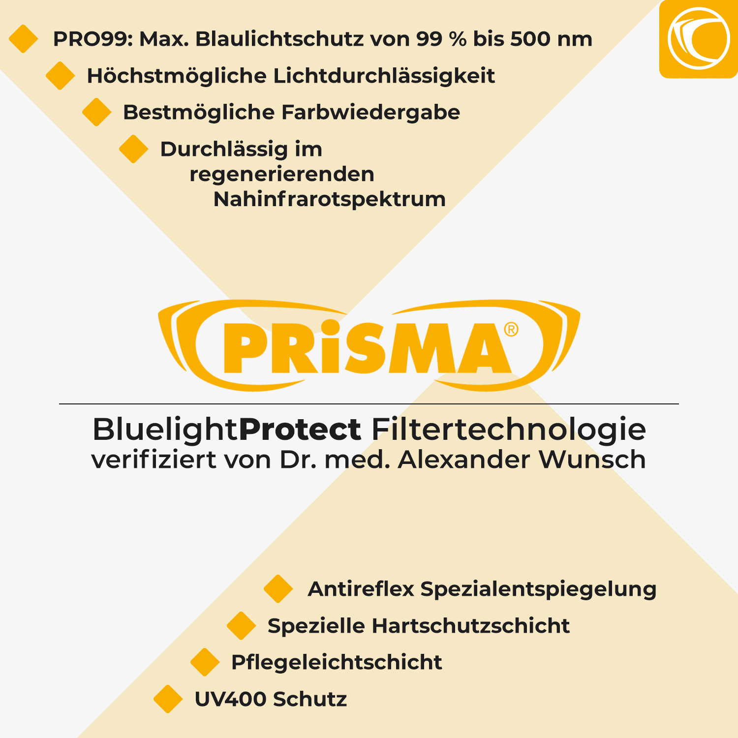 EIGENSCHAFTEN: PRO99 steht für maximalen Blaulichtschutz von 99% bis 500 nm und einer Lichttransmission (Lichtdurchlässigkeit) von über 60%. Die orange-amberfarbenen Gläser sind vollentspiegelt. 100%iger UV400 Filter Schutz vor Sonneneinstrahlung. Brillen werden mit deutscher Technologie konzipiert