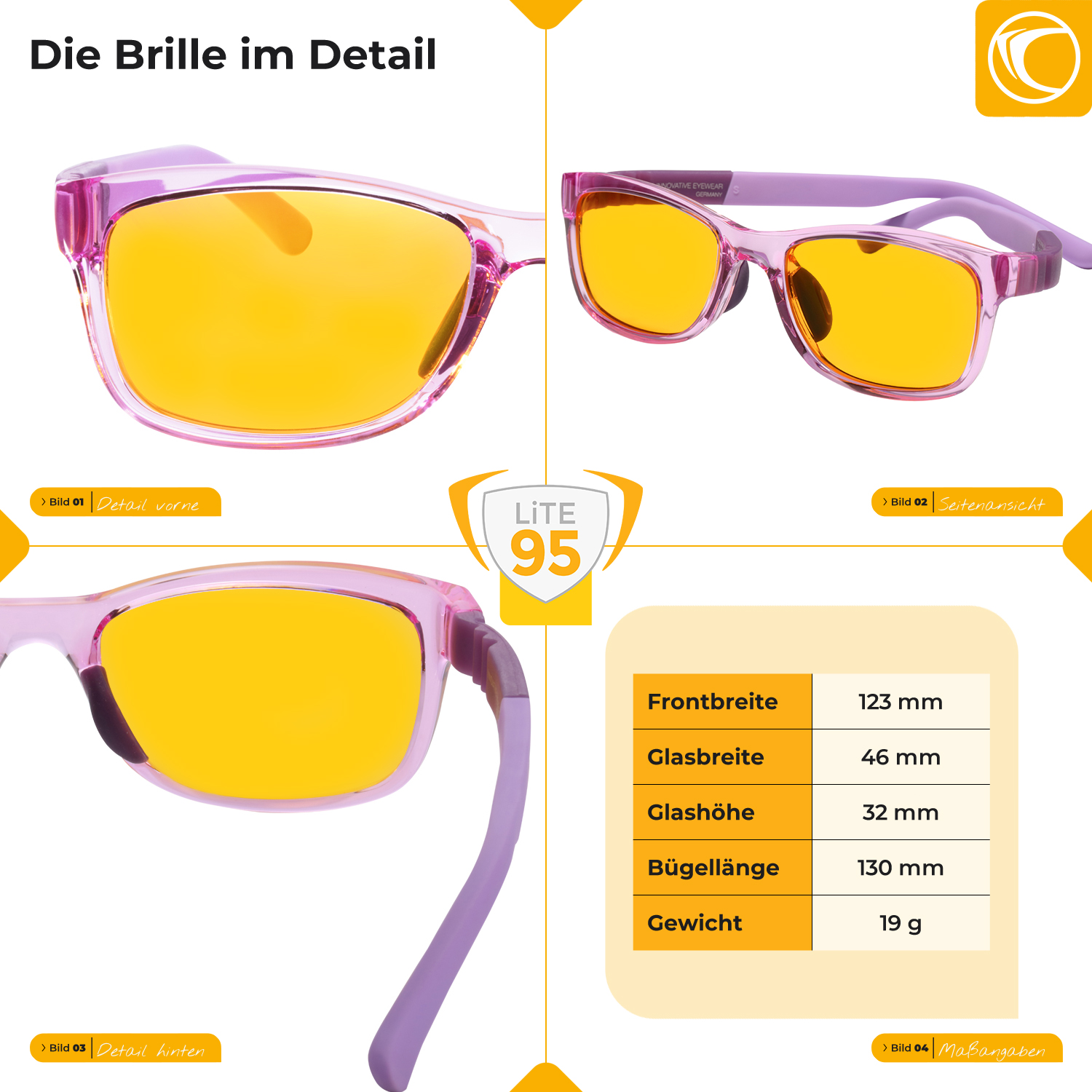 EIGENSCHAFTEN: LITE95 steht für hohen Blaulichtschutz von 95% bis 500nm und einer Lichttransmission von über 75%. Die gelb- amberfarbenen Gläser sind vollentspiegelt. UV400 Filter schützt vor Sonneneinstrahlung. Brillen werden mit deutscher Technologie konzipiert