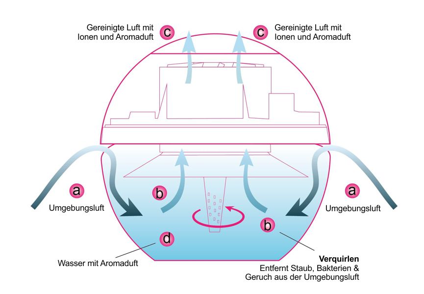 Das patentierte mehrstufige Wassersprühsystem wäscht 99% Staub, Pollen, Allergene, Viren, Bakterien, Gerüche und andere organische Schadstoffe aus der Luft. Das Gerät kann selbst Partikeln mit einem Durchmesser von weniger als 0,1 Mikrometer aus der Luft filtern. Der integrierte Ionisator ist in der Lage Anionen in großen Mengen zu erzeugen, was die Umgebungsluft erfrischt, als ob man im Wald wäre. Darüber hinaus erhöht die eingebaute UV- Lampe die Effizienz der Beseitigung von Bakterien. Während das Wassersprühsystem arbeitet, funktioniert dieses Gerät zugleich als Luftbefeuchter. Im Vergleich zu anderen Luftreinigern ist die Luft, die aus unserem Produkt austritt, viel frischer und komfortabler und duftet nach einer Brise erfrischenden Sommerregens. Der Ionisator produziert gleichzeitig Millionen von natürlichen negativen Ionen, was die Luft zusätzlicher frischer macht.