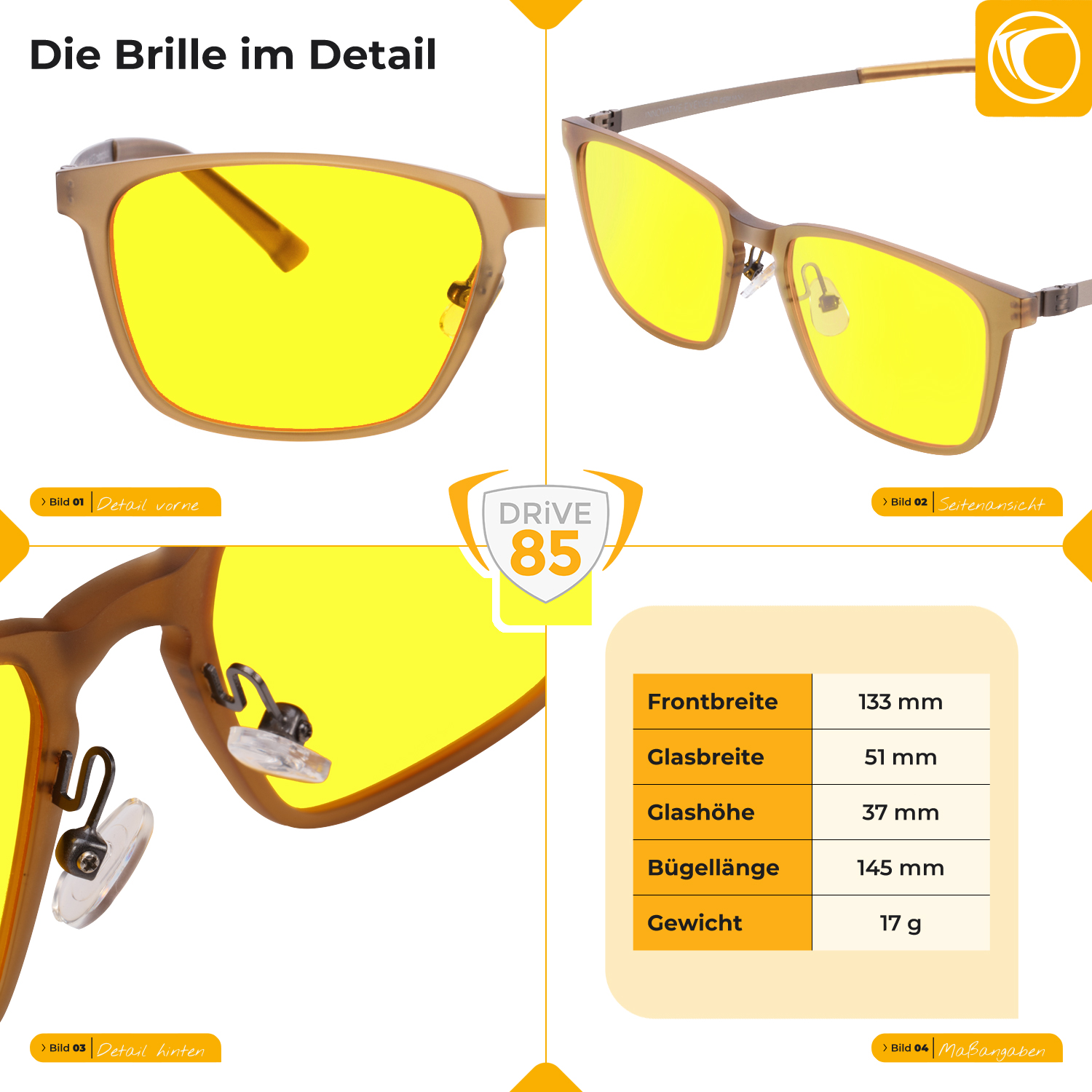 EIGENSCHAFTEN: DRIVE85. Der Blaulichtfilter der DRIVE Day&Night filtert mehr als 85% des blendenden Blaulichts von Xenon und LED Scheinwerfern heraus und weist eine Lichttransmission von 87% auf. Damit sind die EU Anforderungen (EN1836-1997) für Signallichterkennung zur Verwendung der DRIVE85 im Straßenverkehr nachweislich erfüllt. Die hellgelb-amberfarbenen Gläser sind vollentspiegelt. 100%iger UV 400 Schutz vor Sonneneinstrahlung. Brillen werden mit deutscher Technologie konzipiert.