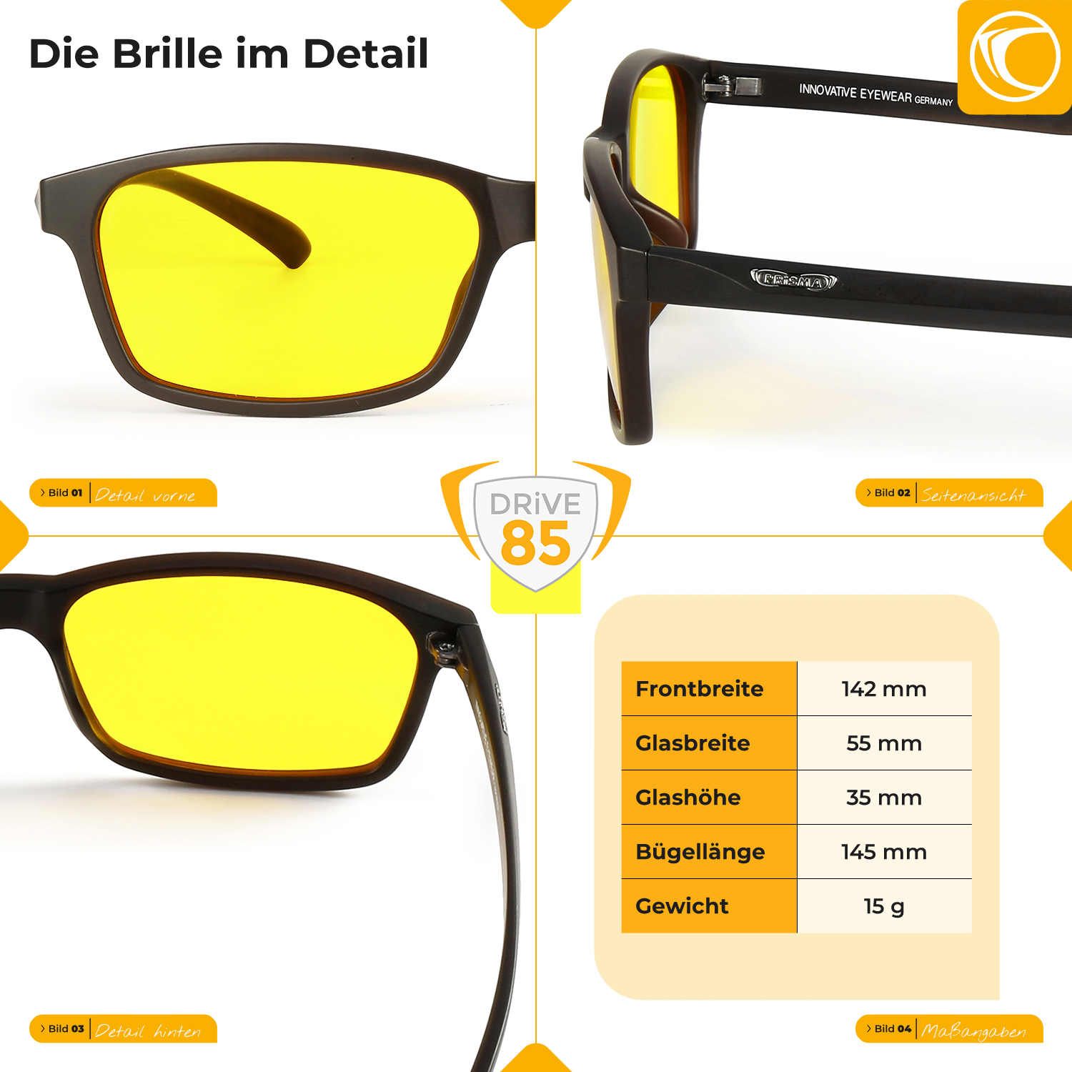EIGENSCHAFTEN: DRIVE85. Der Blaulichtfilter der DRIVE Day&Night filtert mehr als 85% des blendenden Blaulichts von Xenon und LED Scheinwerfern heraus und weist eine Lichttransmission von 87% auf. Damit sind die EU Anforderungen (EN1836-1997) für Signallichterkennung zur Verwendung der DRIVE85 im Straßenverkehr nachweislich erfüllt. Die hellgelb-amberfarbenen Gläser sind vollentspiegelt. 100%iger UV 400 Schutz vor Sonneneinstrahlung. Brillen werden mit deutscher Technologie konzipiert.