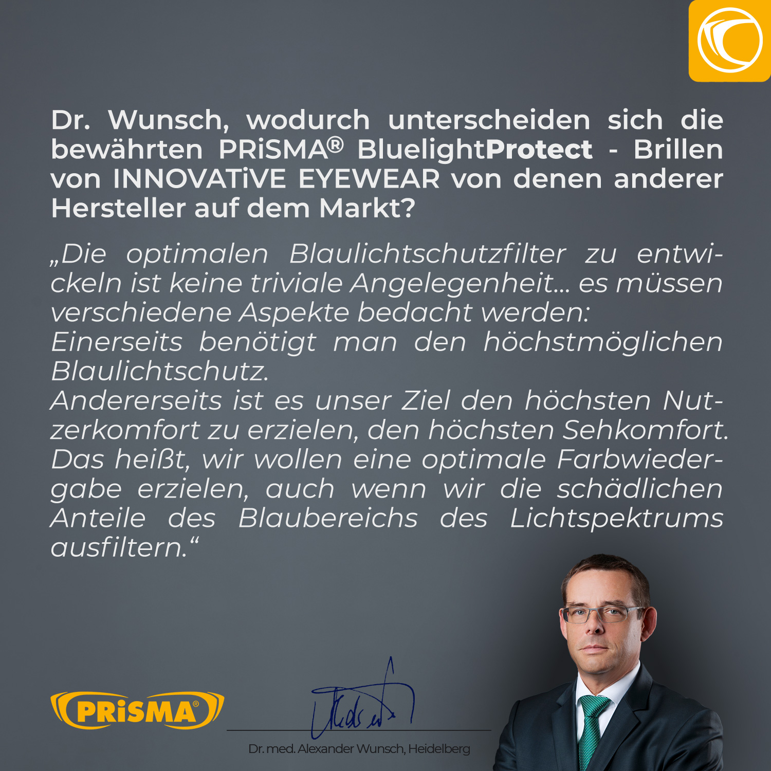 Die PRISMA- Bildschirmbrillen bieten durch ihre fein abgestimmten bluelightprotect- Filter einen zuverlässigen Schutz sowohl vor den belastenden Blauanteilen im Licht der Flachbildschirme (Quecksilber- bzw. LED-Licht) und Computermonitore als auch vor allen anderen stark blauhaltigen künstlichen Lichtquellen. Neben dem Schutz der Augen kann eine Brille mit Blaulichtfilter auch dazu beitragen, dass Sie sich weniger müde und gestresst fühlen, da das blaue Licht auch die Produktion von Melatonin- dem "Schlafhormon"- im Körper beeinträchtigen kann. Durch den Blaulicht-Blocker kann eine solche Computerbrille Sie also ebenfalls dabei unterstützen, besser zu schlafen und sich am Tag ausgeruhter zu fühlen.