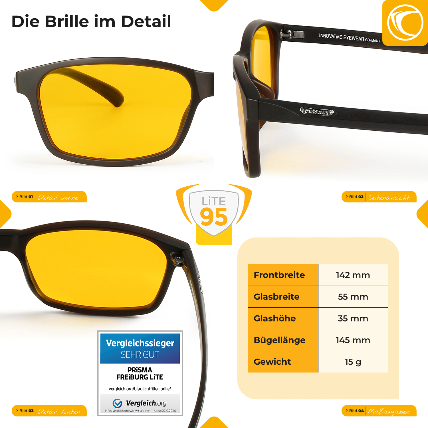 EIGENSCHAFTEN: LITE95 steht für hohen Blaulichtschutz von 95% bis 500nm und einer Lichttransmission von über 75%. Die gelb-amberfarbenen Gläser sind vollentspiegelt. 100%iger UV400 Filter Schutz vor Sonneneinstrahlung. Brillen werden mit deutscher Technologie konzipiert