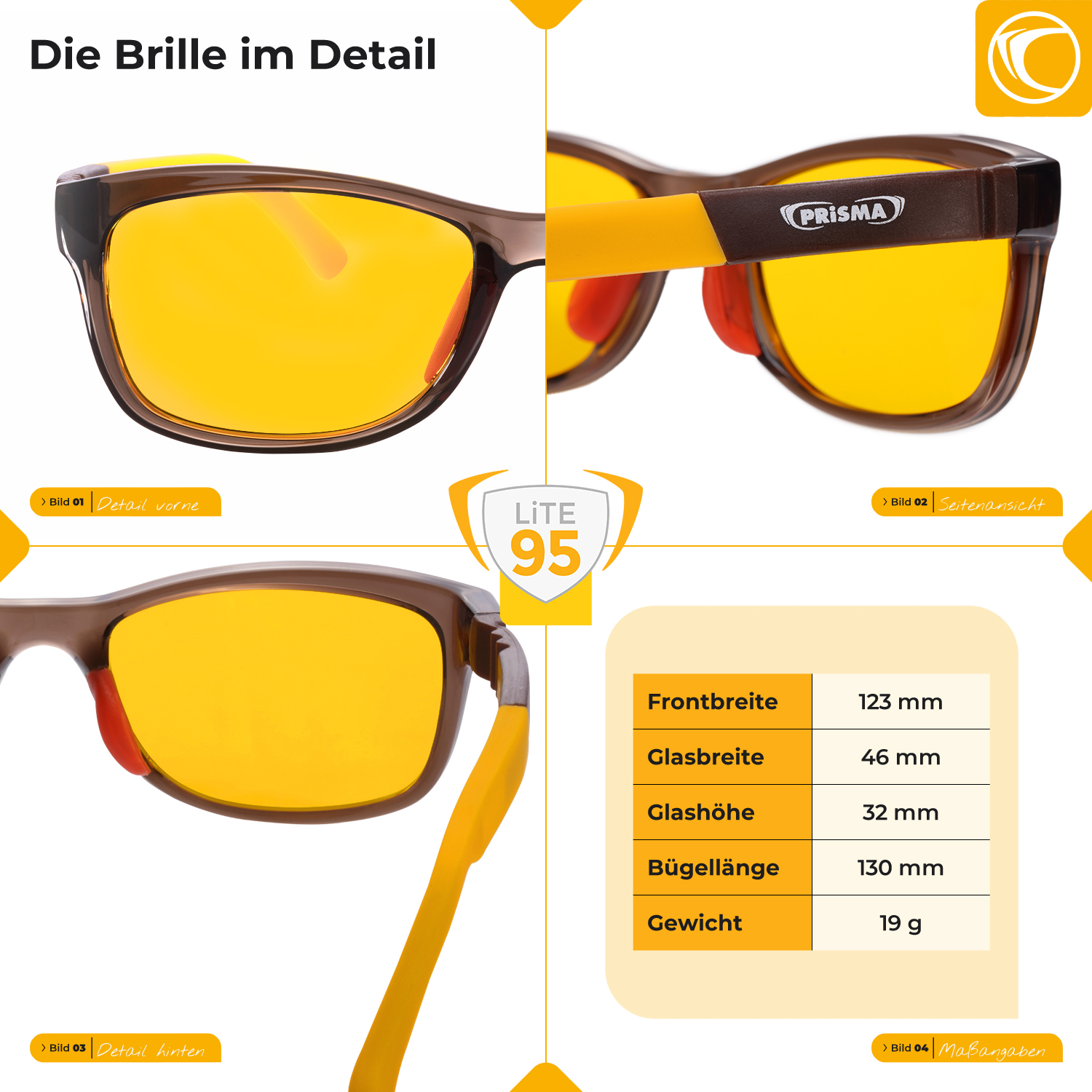 EIGENSCHAFTEN: LITE95 steht für hohen Blaulichtschutz von 95% bis 500nm und einer Lichttransmission von über 75%. Die gelb- amberfarbenen Gläser sind vollentspiegelt. UV400 Filter schützt vor Sonneneinstrahlung. Brillen werden mit deutscher Technologie konzipiert