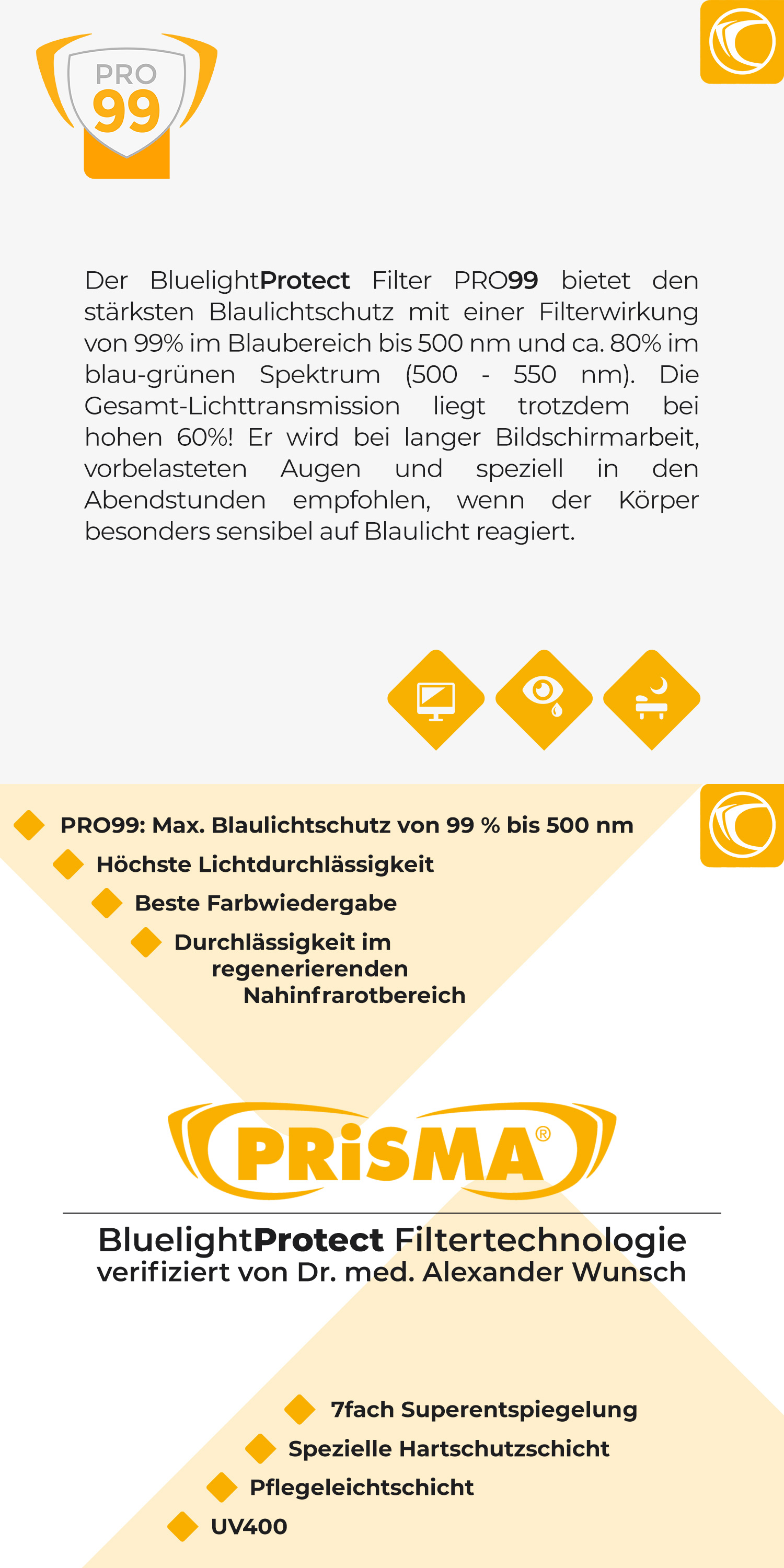 ANWENDUNG: Der Blaulichtschutz PRO99 bedeutet höchsten Schutz der Augen und des Organismus. Bei langer Bildschirmarbeit, vorbelasteten Augen und speziell in den Abend- und Nachtstunden, wenn das Hormonsystem hochsensibel auf Blaulicht reagiert.
