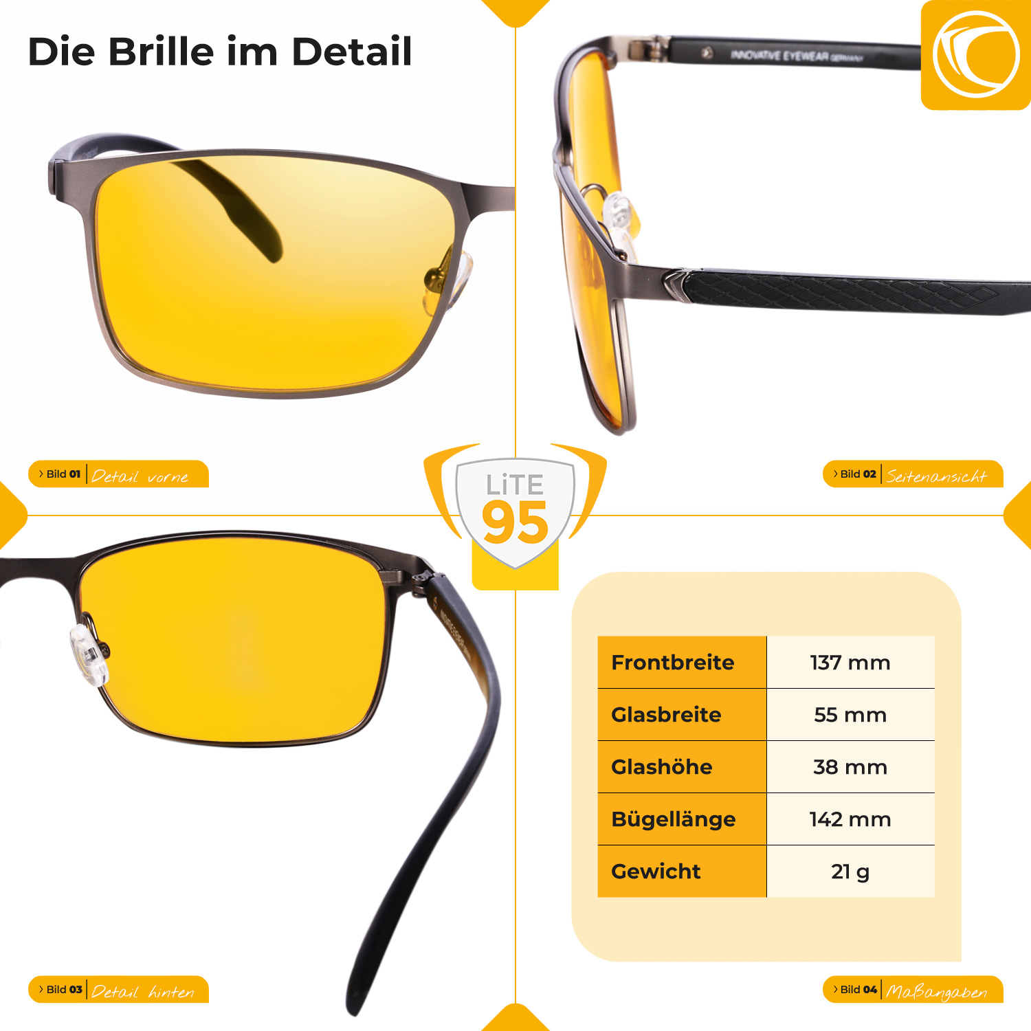 EIGENSCHAFTEN: LITE95 steht für hohen Blaulichtschutz von 95% bis 500nm und einer Lichttransmission (Lichtdurchlässigkeit) von über 75%. Die gelb-amberfarbenen Gläser sind vollentspiegelt. 100%iger UV400 Filter Schutz vor Sonneneinstrahlung. Brillen werden mit deutscher Technologie konzipiert