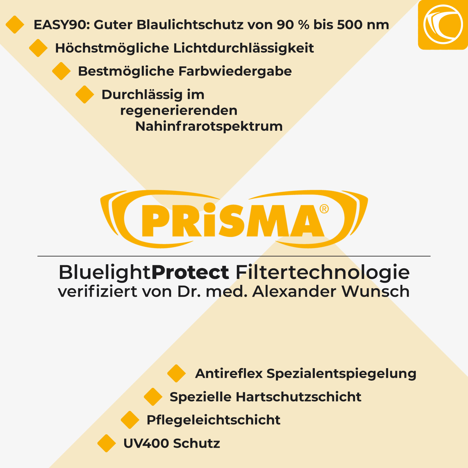 Die PRISMA- Bildschirmbrillen bieten durch ihre fein abgestimmten bluelightprotect- Filter einen zuverlässigen Schutz sowohl vor den belastenden Blauanteilen im Licht der Flachbildschirme (Quecksilber- bzw. LED-Licht) und Computermonitore als aiuch vor allen anderen stark blauhaltigen künstlichen Lichtquellen. Neben dem Schutz der Augen kann eine Brille mit Blaulichtfilter auch dazu beitragen, dass Sie sich weniger müde und gestresst fühlen, da das blaue Licht auch die Produktion von Melatonin- dem "Schlafhormon"- im Körper beeinträchtigen kann. Durch den Blaulicht-Blocker kann eine solche Computerbrille Sie also ebenfalls dabei unterstützen, besser zu schlafen und sich am Tag ausgeruhter zu fühlen.