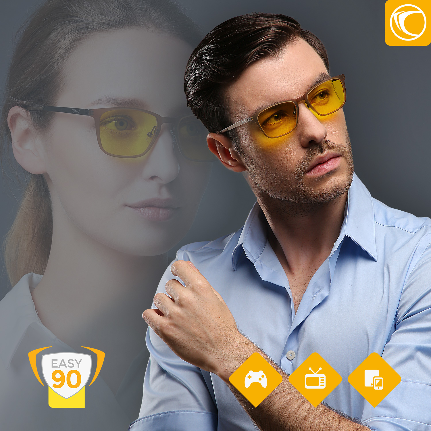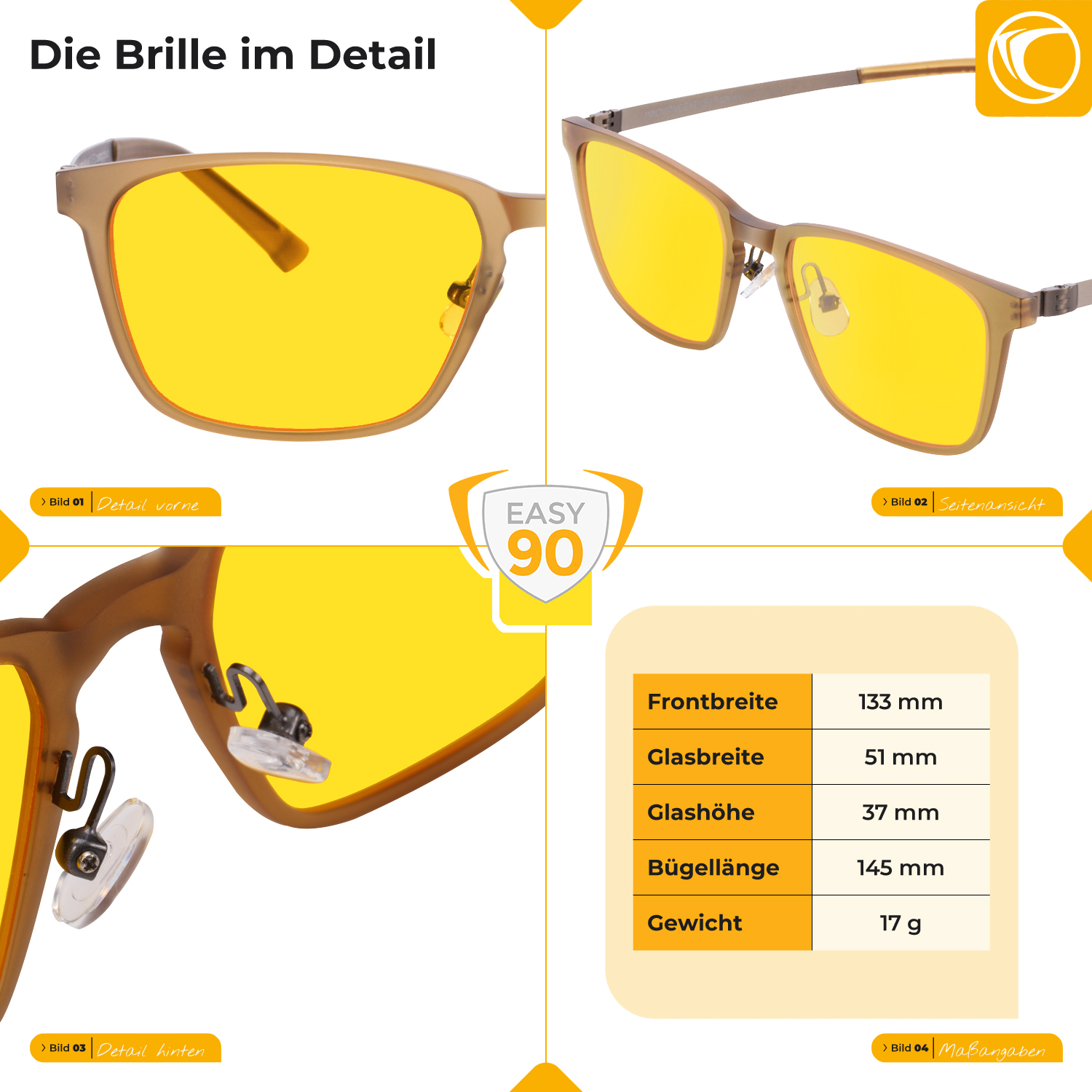 EIGENSCHAFTEN: EASY90. Der Blaulichtfilter der EASY90 steht für hohe Farbechtheit und einen guten Blaulichtschutz von 90% bis 500 nm und einer Lichttransmission (Lichtdurchlässigkeit) von über 80%. Die gelb-amberfarbenen Gläser sind vollentspiegelt. 100%iger UV400 Filter Schutz vor Sonneneinstrahlung. Brillen werden mit deutscher Technologie konzipiert