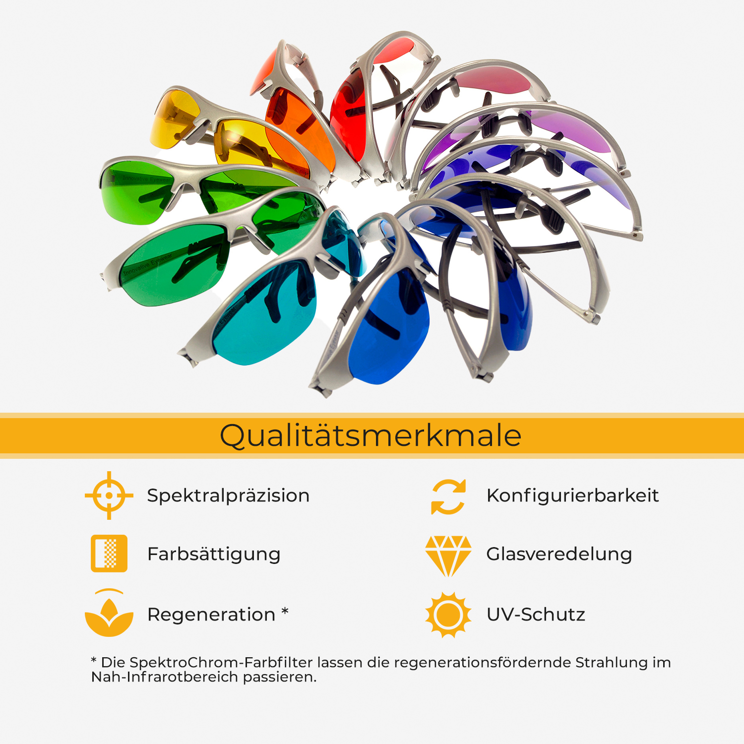 Die SpektroChrom Farblichtmethode nach Dinshah P. Ghadiali ist die bewährte Farblichtanwendung, bei der allen Organsystemen und Funktionen des Körpers ganz besondere Farben zugeordnet sind. Dank der SpektroChrom Farbbrillen gibt es Spektro-Chrom jetzt auch für die Augen! Die Farbfilter sind optimal auf die Augen und die Spektro-Chrom Anwendung abgestimmt. Komfortabel und leicht, jederzeit und überall nach den Spektro-Chrom Vorgaben angewendet, tragen sie zur sanften Harmonisierung und Normalisierung der physiologischen Vorgänge bei.